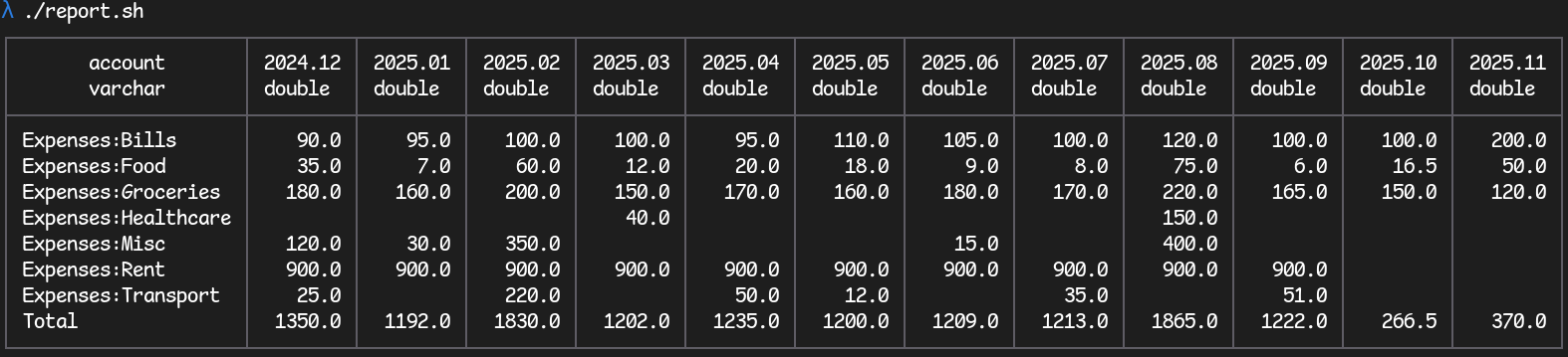 For example, in the sample report above, the spending in the Expenses:Misc category is much higher than usual in 2025.02 and 2025.08,