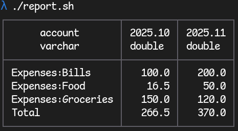 Requirements: ledger-cli and DuckDB.